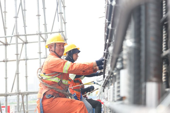 蚌埠市延安路大桥及接线工程线路全长2733米。其中,跨河段为中铁四局承建的世界首个双塔双索面非对称大跨度异形挂孔梁斜拉桥,长度840米,主跨420米,是淮河流域主跨最大桥梁。在主塔施工期间,项目部针对“蚌”形塔柱的曲面控制难度大,施工线形控制要求高,塔柱钢筋、劲性骨架预埋件多低息股票配资,测量精度高,混凝土质量控制难等施工重难点,通过BIM建模对主塔线形进行模拟、配套智能爬模体系、制定专项测量方案、优化混凝土配合比等方式,有效保障了主塔施工安全平稳有序推进。目前,项目部已同步启动主塔下横梁施工,各工序衔接顺畅,预计在今年6月中旬完成主塔下横梁施工。