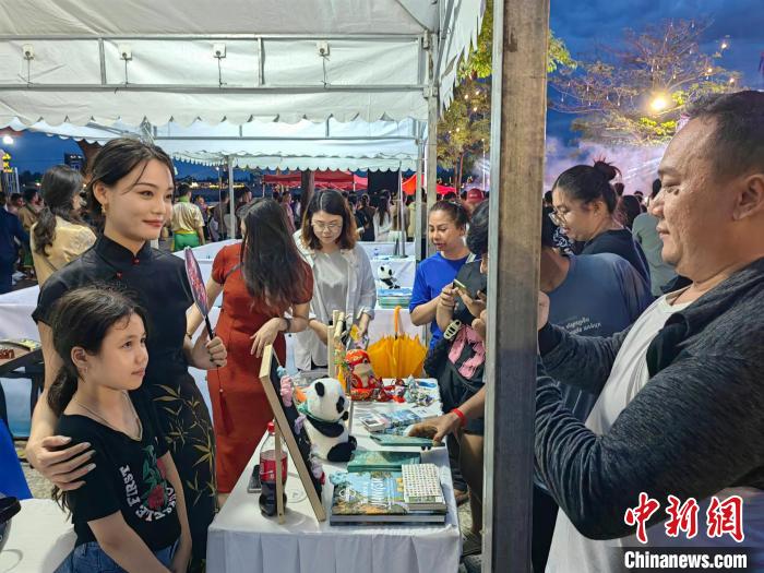 5月24日晚,一名当地小女孩在金边步行街市集摊位上与中国大姐姐合影。中新网记者杨强摄