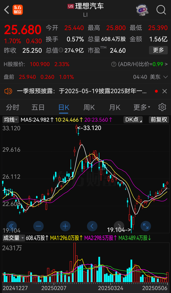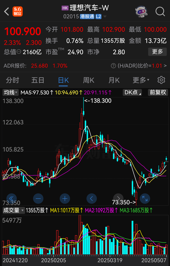 5月7日收盘,理想汽车港股股价为100.9港元/股,总市值为2160亿港元。