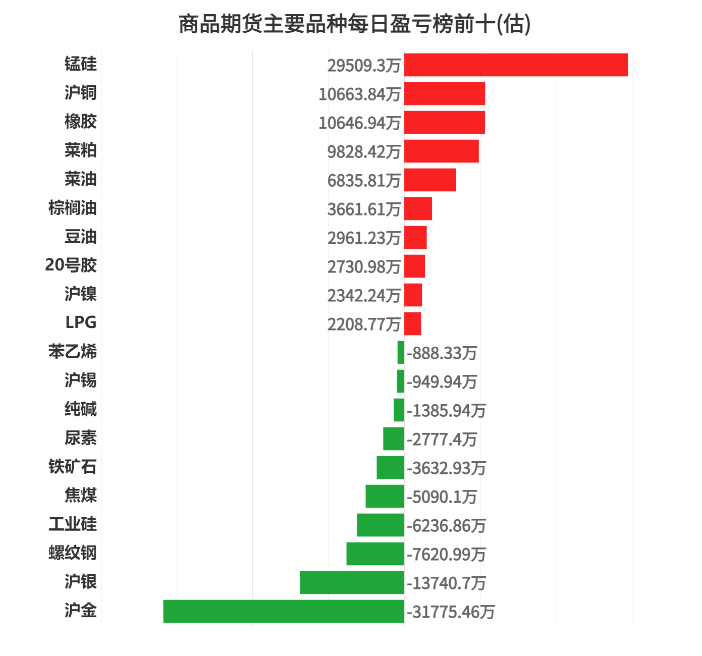 品种盈亏榜:今日商品期货上榜机构席位中锰硅盈利第一,为29509.30万元。