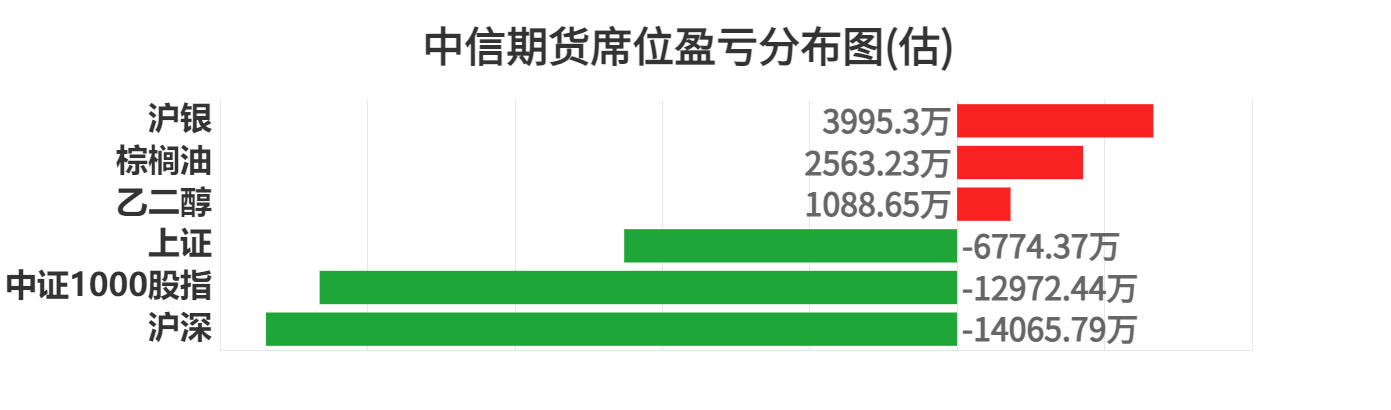 就中信期货席位而言,今日盈利前三品种为沪银、棕榈油、乙二醇,分别盈利3995.30万元、2563.23万元、1088.65万元。