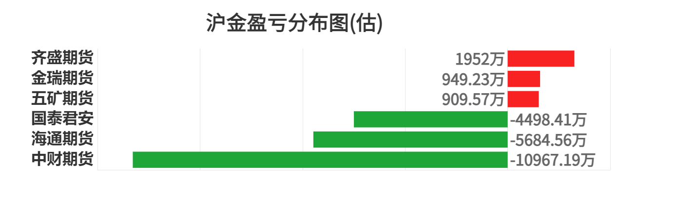 就沪金而言,今日盈利前三席位为齐盛期货、金瑞期货、五矿期货,分别盈利1952.00万元、949.23万元、909.57万元。