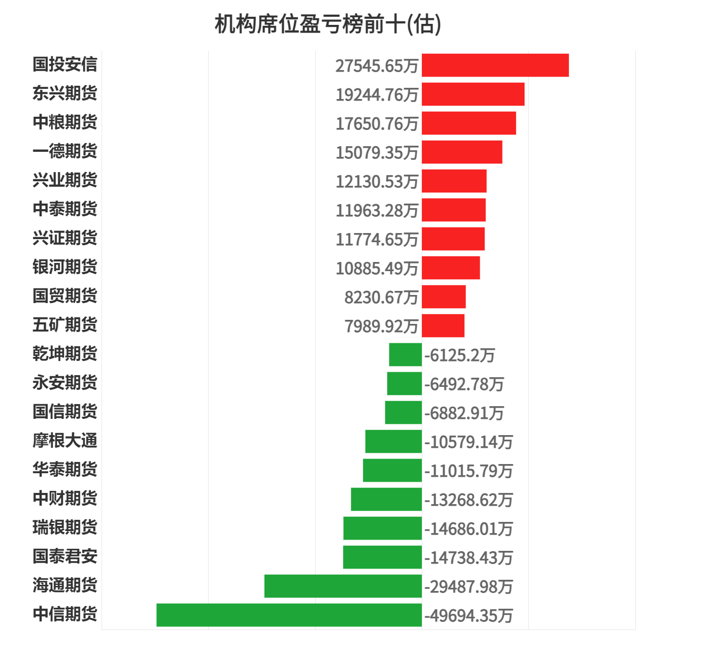 今日亏损前三席位为中财期货、海通期货、国泰君安,分别亏损10967.19万元、5684.56万元、4498.41万元。